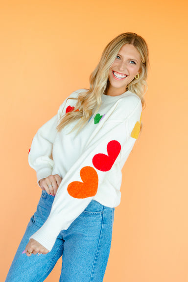 Fall in love with our Love Story Heart Sweater! This classic crewneck boasts vibrant knit hearts, adding a touch of whimsy to any outfit. Snuggle u...
