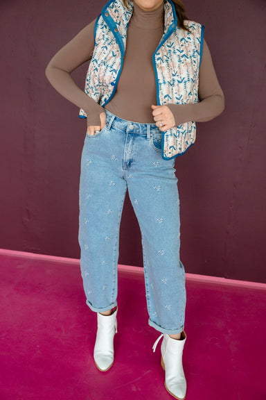 Step into style with these Daisy Embroidered Barrel Jeans in a breezy light wash. The high-rise fit flatters your waist while the playful embroider...