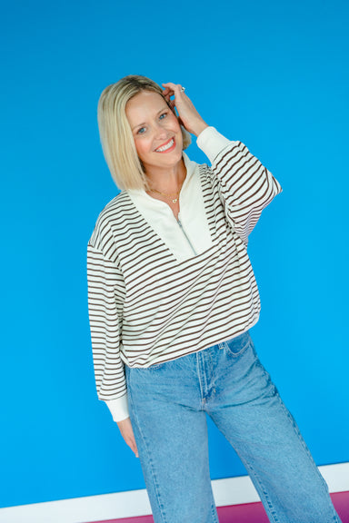 Get cozy and stylish with the Gracie Half Zip Striped Pullover in Oatmeal and Dark Chocolate. This long sleeve sweatshirt features a fun half-zip d...