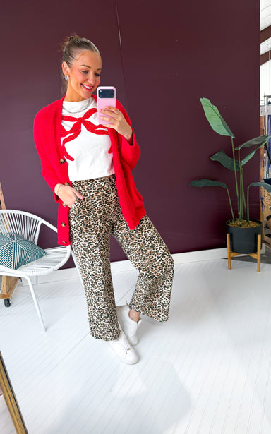 Step out in style with the Rowen Leopard Print Pants, featuring a bold mix of dark brown, espresso, and beige tones. These playful pants bring a wi...