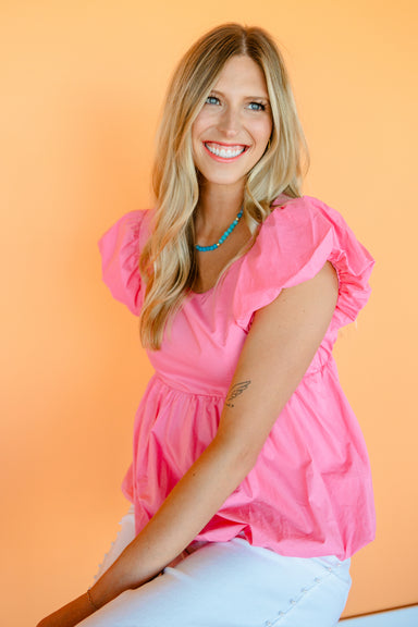 Add a pop of playful charm to your wardrobe with the Gwyneth Puff Sleeve Peplum Top in vibrant Geranium Pink. Featuring a solid color, u-neck desig...