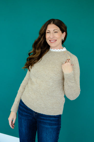 Wrap yourself in cozy charm with the Joline Lace Detail Sweater in soft beige and cream. The delicate lace neckline adds a touch of whimsy, while t...