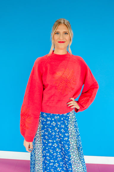 This embroidered mock neck sweater is an essential for those breezy Fall days! Soft sweater knit shapes a mock neckline, raglan seam long balloon s...