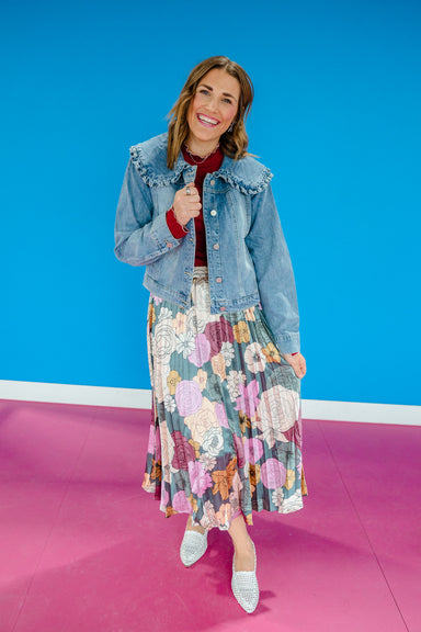This light wash denim jacket brings a playful twist to your wardrobe with its ruffled sailor collar and cropped length. Featuring a button-down fro...