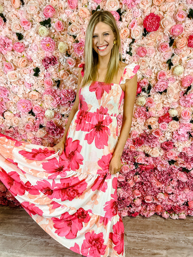 Twirl into spring with the Madeline Smocked Ruffle Maxi Dress, where delicate florals dance across a dreamy color palette of light blue, raspberry,...