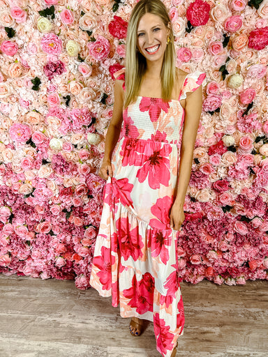 Get ready to twirl in the Nadia Midi Dress! With its smocked top and flowy midi length, this dress is both comfortable and stylish. The delicate fl...