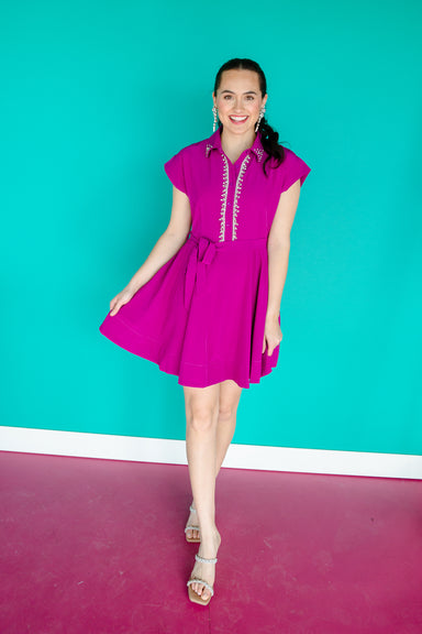 Slip into effortless elegance with the Farah Rhinestone Mini Dress in stunning Amethyst. This short sleeve stunner features a removable self belt f...