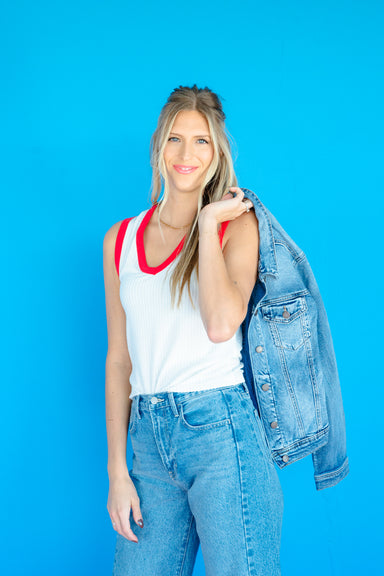 Add a pop of fun to your wardrobe with the Feah V-Neck Tank in True Red and Soft White. This ribbed tank features a flattering v-neck and contrasti...