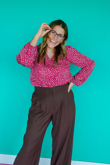 Add a fun twist to your wardrobe with the Elodie Polka Dot Printed Top in berry. Featuring a playful polka dot pattern and charming ruffled V-neck ...