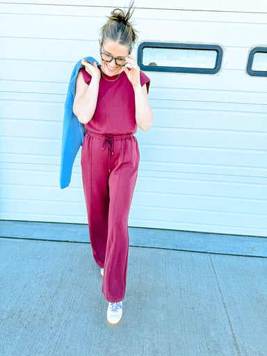 Elevate your wardrobe with the Zuri Pleated Top and Pants Set in rich burgundy. This chic two-piece features a flattering pleated top with a charmi...