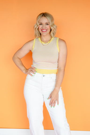 Brighten up your wardrobe with this eye-catching Marley Sweater Tank! The cheerful canary yellow and light purple stripes create a playful pop of c...