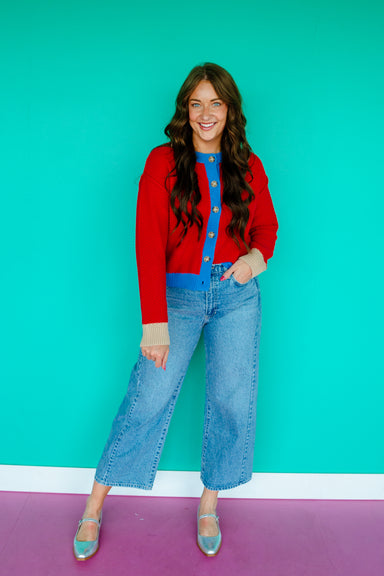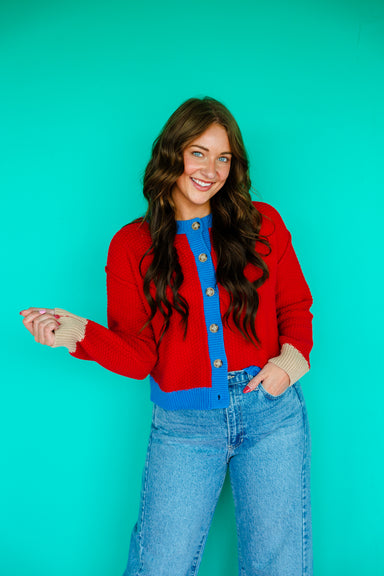 Wrap yourself in cozy charm with the Frida Textured Cardigan in True Red and Heliotrope. Its playful waffle knit texture and bold color block desig...