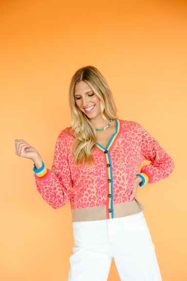Wrap yourself in cozy charm with the Wrenlee Cardigan. This long-sleeve button-down sweater features a fun leopard print and playful multicolor bin...
