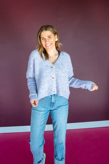 Wrap yourself in pure coziness with the Rochelle Button Down Cardigan in Lavender. This oversized beauty features a soft, fuzzy ribbed knit that fe...