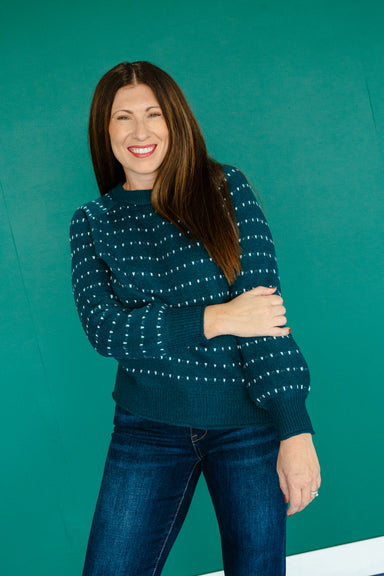 Stay cozy and chic with the Eva Textured Sweater in Kingfisher. This playful pullover features a classic crew neck and long sleeves, adorned with c...
