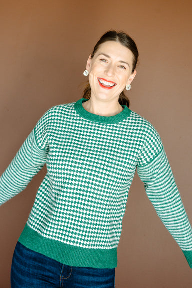 Wrap yourself in cozy comfort with the Vianney Crewneck Sweater, where forest green meets eye-catching mixed print details. This playful layer brin...