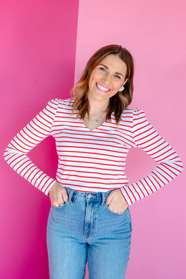 Stripes never go out of style, and this Carol tee proves it! The scalloped V-neckline adds a flirty feminine touch, while the long sleeves keep thi...