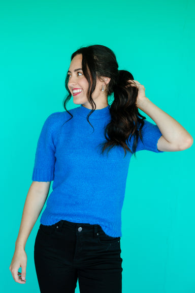 Brighten your wardrobe with the Moriah Short Sleeve Sweater in turquoise blue. Featuring a playful cut-out back with a tie detail and a chic mock n...