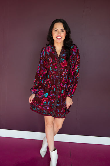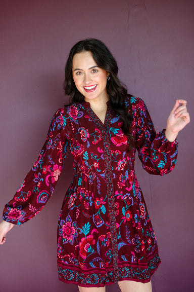 Embrace a world of color and comfort with this gorgeous mini dress. Long balloon sleeves frame a split neckline that leads to buttons down the cent...