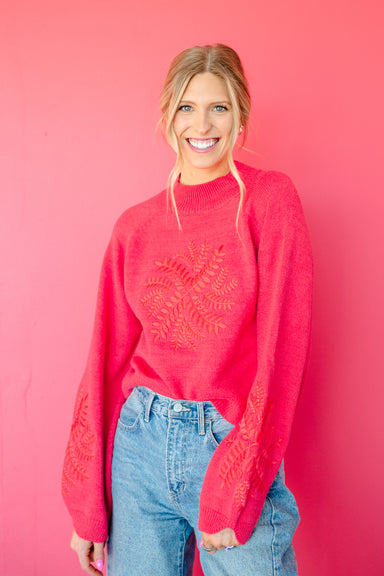 This embroidered mock neck sweater is an essential for those breezy Fall days! Soft sweater knit shapes a mock neckline, raglan seam long balloon s...