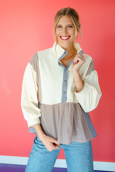 Elevate your casual wardrobe with this playful peplum sweatshirt that brings personality to everyday style. The chocolate and ivory colorblock desi...
