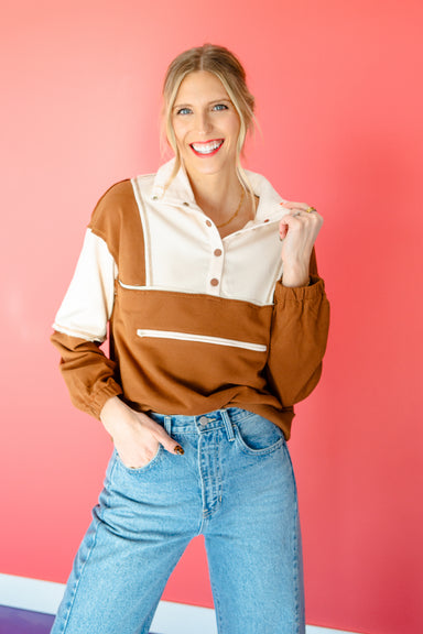 Effortless style meets cozy comfort in this charming colorblock pullover! Featuring a relaxed drop shoulder silhouette in rich chocolate and creamy...
