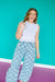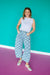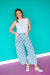 Fits true to size but slightly cropped. If in between we recommend sizing up for more length. Material has moderate stretch.