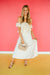 Introducing the Junie! This is an off-the-shoulder, cropped top in a light cream or ivory color. Its most prominent feature is the multiple horizontal tiers of gathered ruffles that make up the entire bodice, creating significant volume and a layered effect. The off-the-shoulder neckline is elasticated, flowing seamlessly into short, fluttery ruffled sleeves that cover the upper arms. The top is made from a lightweight, crinkle gauze fabric, giving it a breezy, slightly sheer appearance. The overall style is feminine, playful, and bohemian, ending around the natural waistline.
