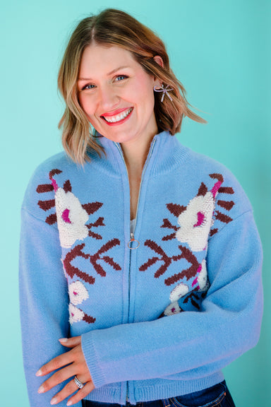 Elevate your everyday style with this charming floral zip-up cardigan that's equal parts cozy and chic. Featuring a standout ribbed stand collar an...