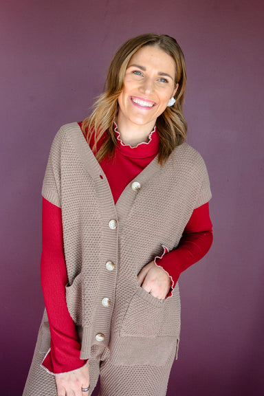 Cozy up in the Erica Waffle Knit Vest and Pant Set in Rose Brown, where comfort meets style. The vest features playful functional buttons and side ...