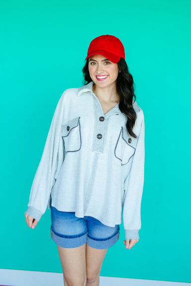 Elevate your everyday style with the Ciera Ribbed Button Top in a gorgeous cornflower hue. This versatile knit features a classic collared neckline...