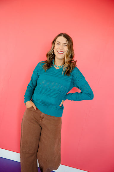 Effortlessly chic and undeniably flirty, the Colleen Open Knit Sweater in Kingfisher brings that "I woke up like this" vibe to your everyday rotati...