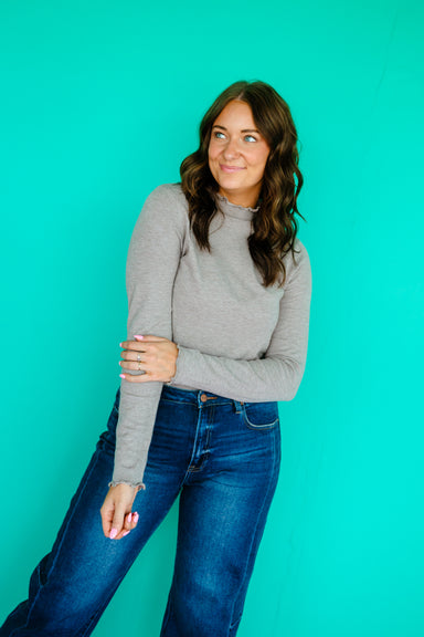 Add a fun twist to your wardrobe with the Coraline Lettuce Edge Long Sleeve Top in Mushroom. Its playful mock neck and delicate lettuce edges bring...
