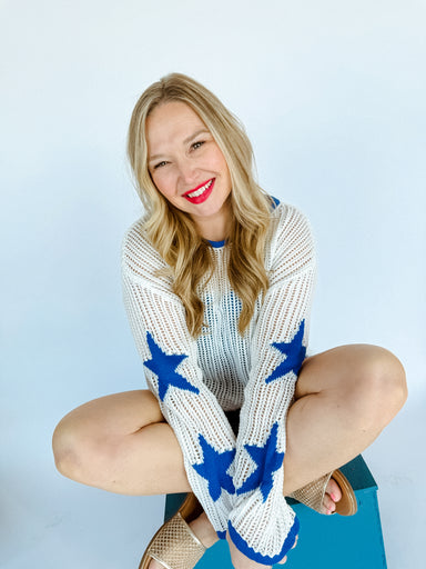 Georgia Open Knit Sweater - Soft White + Bright Blue