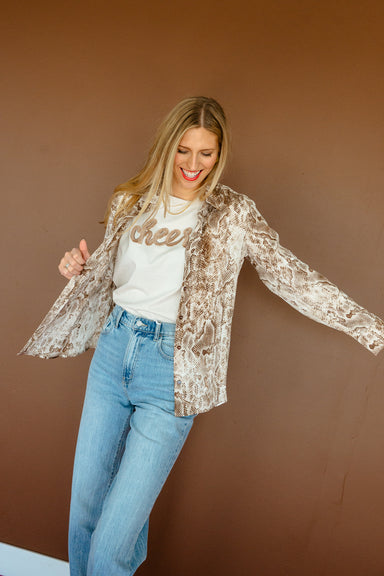 Turn up the fun with the Christy Sequin Snake Print Top in warm coffee, brown, and beige tones. This cropped gem sparkles with sequins that catch e...