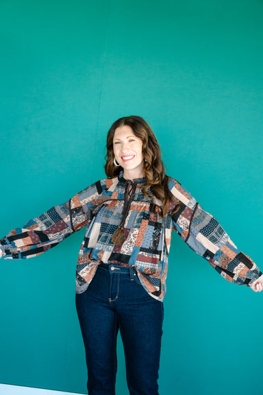 Grab some jeans and chic ankle boots to pair with this mixed patchwork babydoll top! Woven fabric, in an allover mixed patchwork print, shapes this...