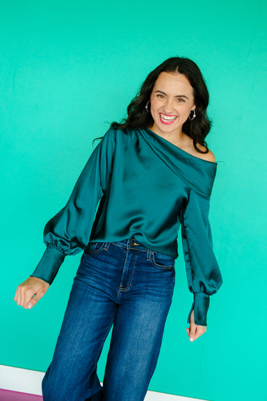 Indulge in luxurious style with our Shelby Drop Shoulder Satin Top in rich pine. The off the shoulder cut and shimmery satin material exude sophist...