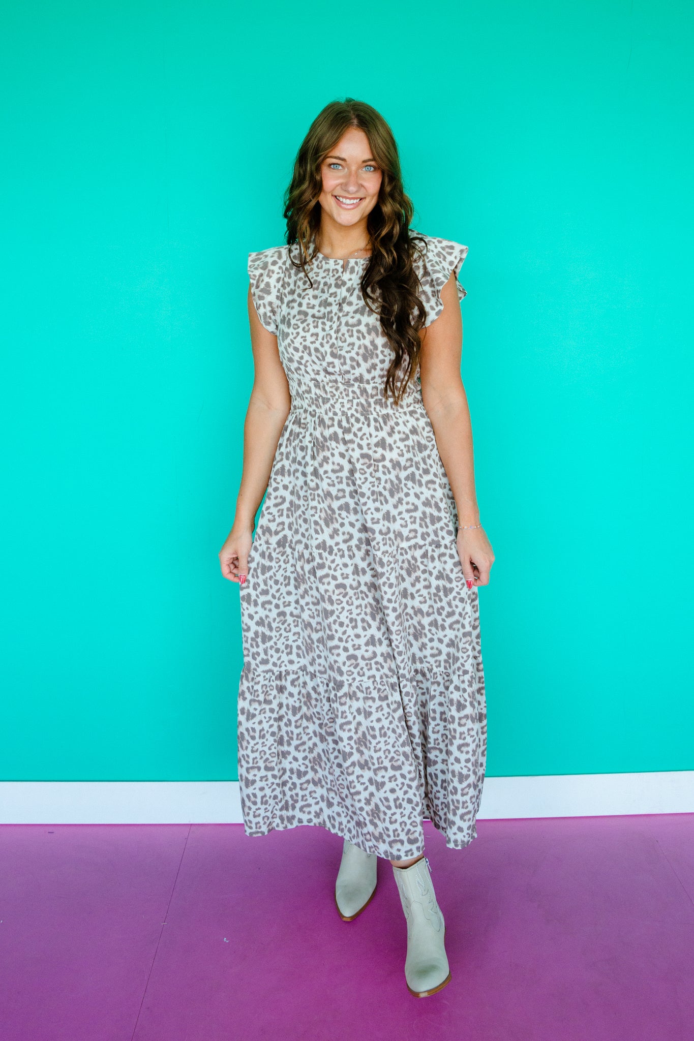 Turn heads in the Alisha Leopard Print Maxi Dress, featuring playful flutter sleeves and a tiered silhouette that moves with you. The rose brown and blush tones add a soft, feminine touch to this bold print, perfect for making a statement wherever you go. Comfortable and stylish, it’s your new go-to for effortless charm and fun vibes.