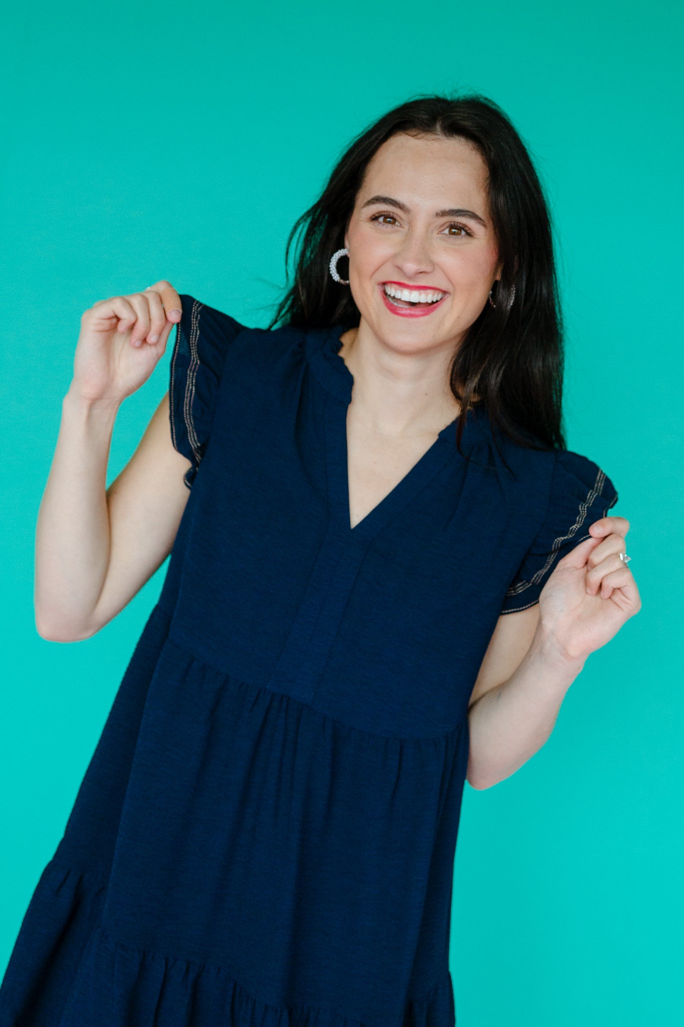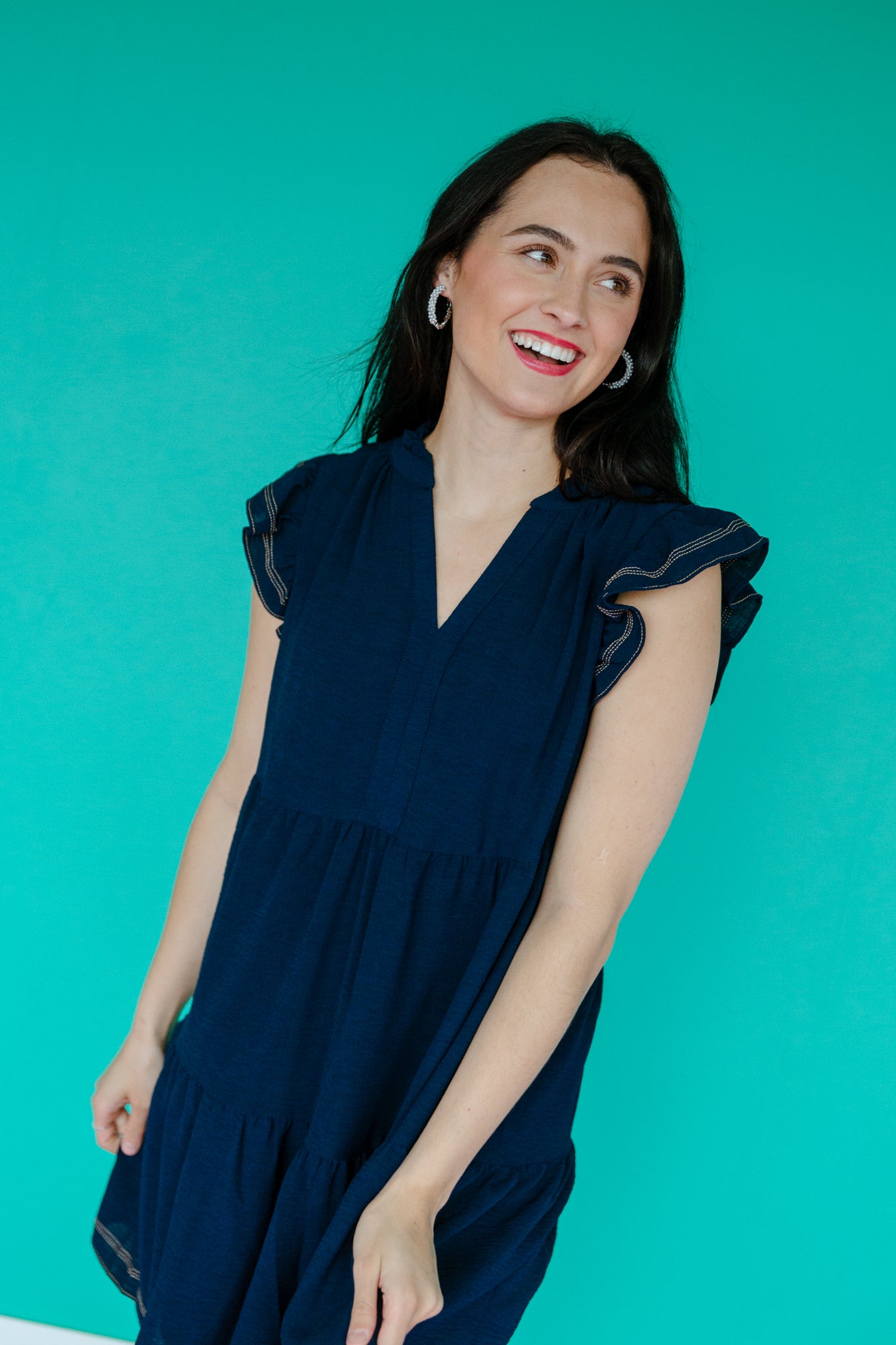 Elevate your style with the Caren Tiered Mini Dress in Dark Navy. Featuring striking contrast stitching and a flattering tiered babydoll silhouette, this dress effortlessly combines comfort and chic. Its lightweight fabric ensures all-day ease, making it the perfect choice for both casual outings and special occasions. Make a confident statement wherever you go.