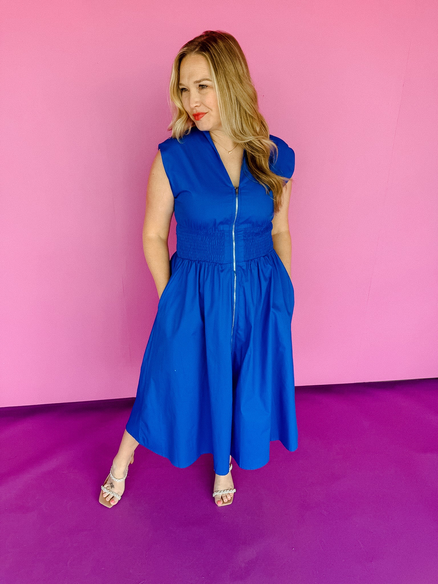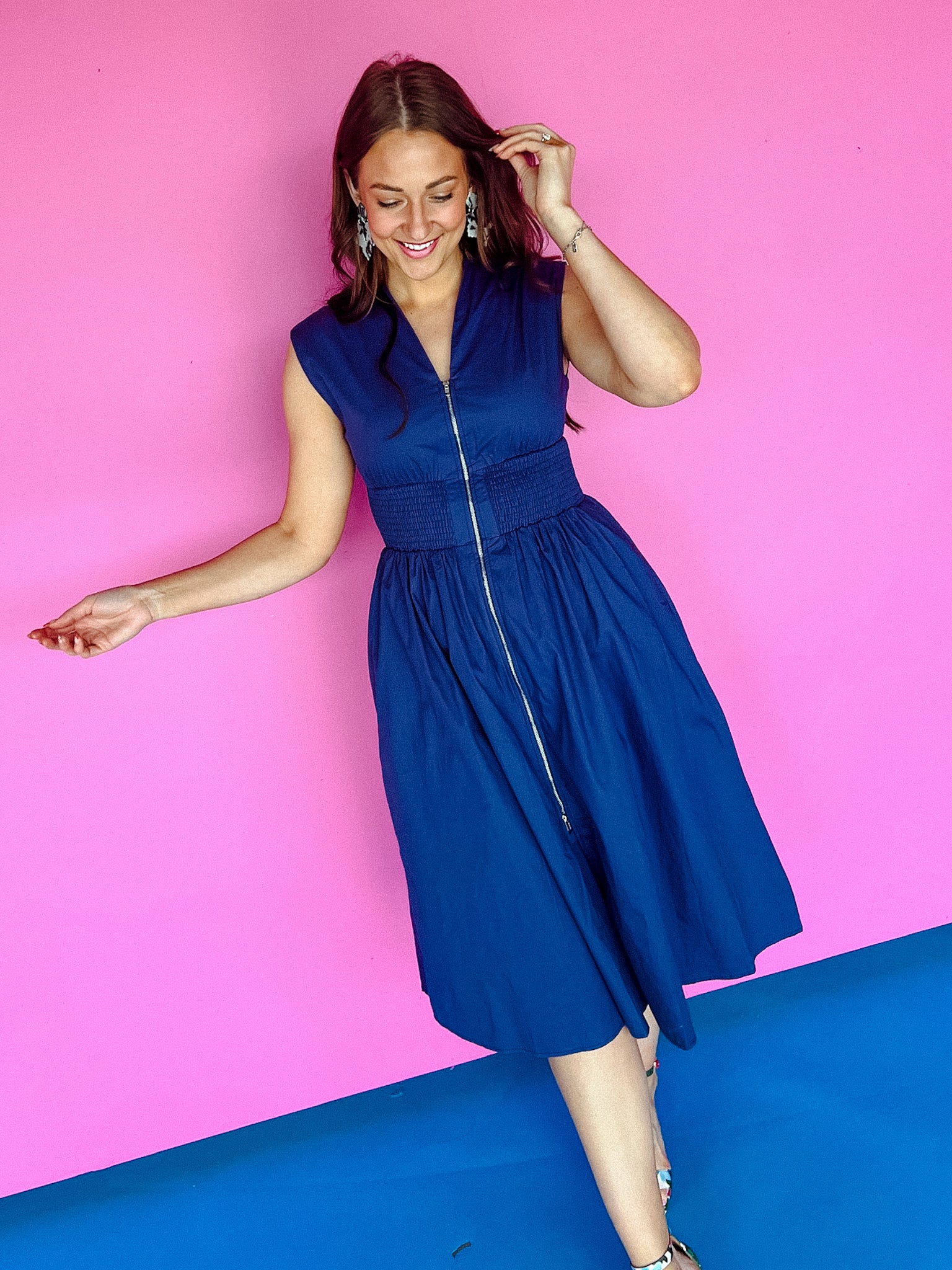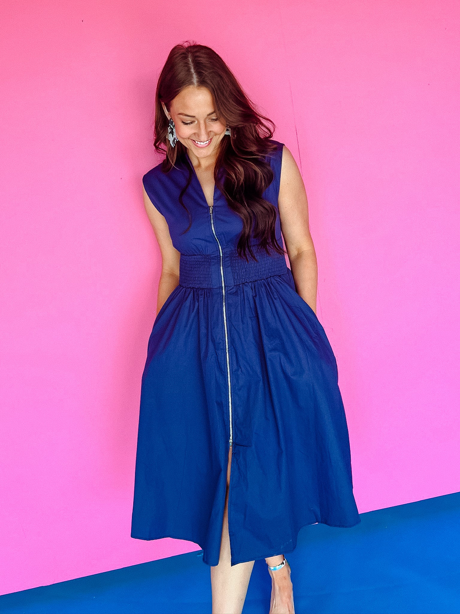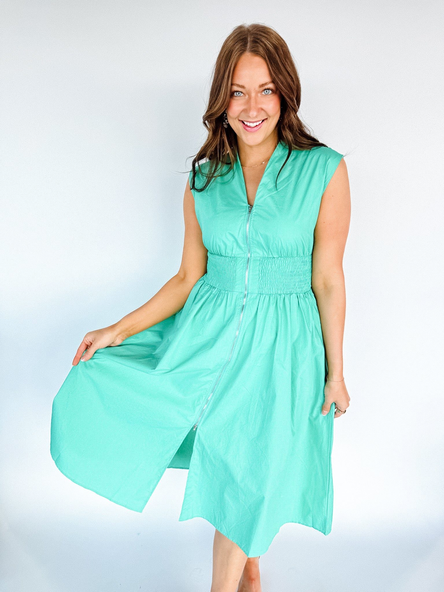 The "do anything" dress! Our Elsa Zip Up Midi Dress is so comfy it will take you anywhere! Its effortless style pairs beautifully with sneakers, sandals, or wedges! This dress is complete with an interior lining, functional front zipper, pockets, and elastic waistband.