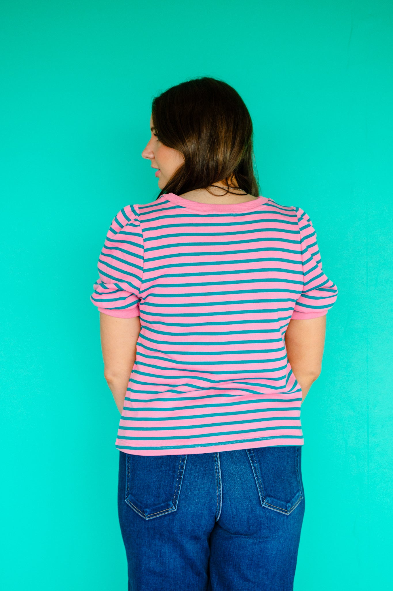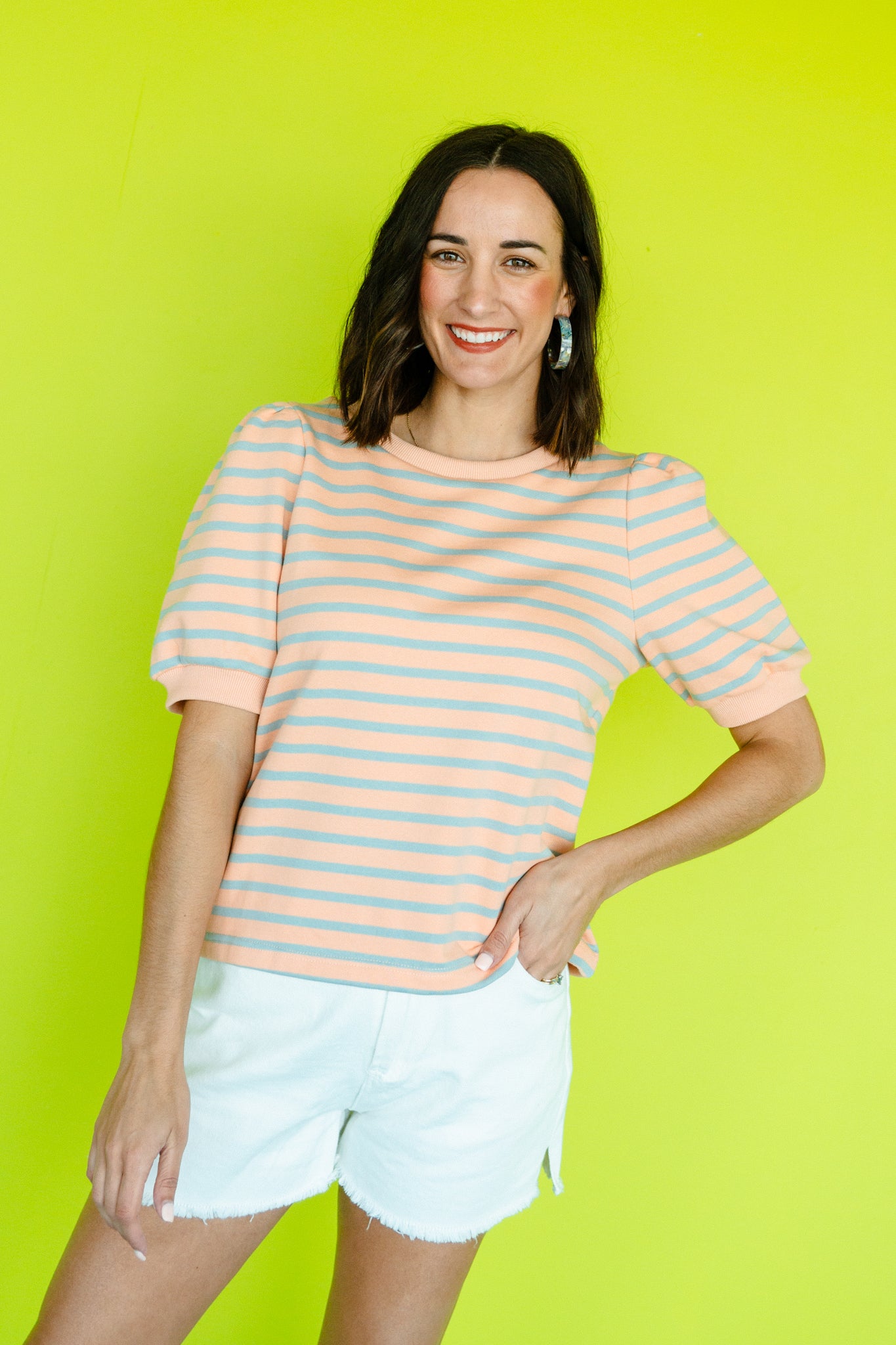 Add a dash of charm to your wardrobe with the Jada Striped Puff Sleeve Top. Crafted from soft French terry, this playful piece features short puff sleeves and a classic crew neck for a relaxed, comfy fit. Its timeless stripe pattern brings a fresh, fun vibe to any outfit, perfect for casual days when you want to feel effortlessly stylish.