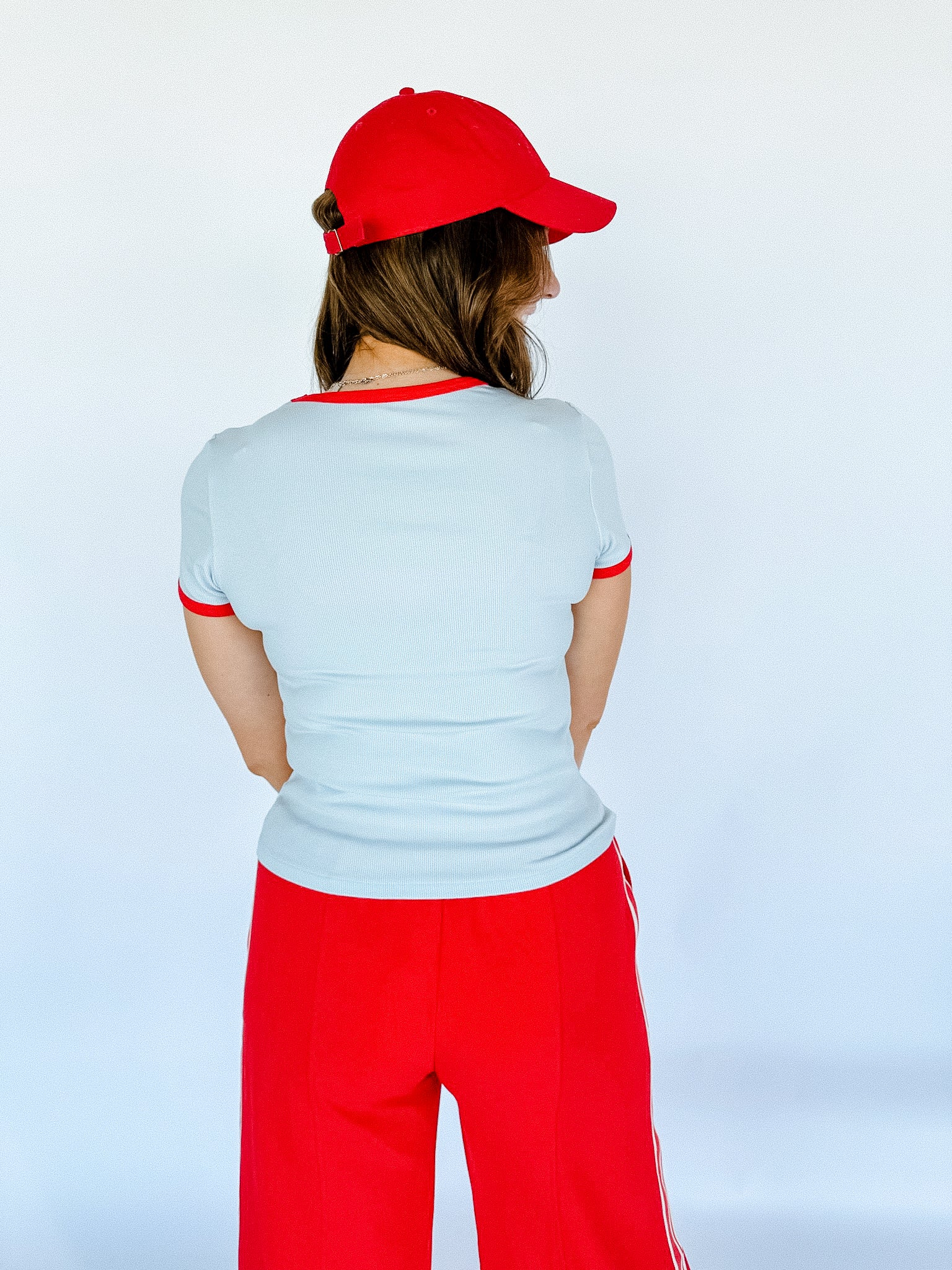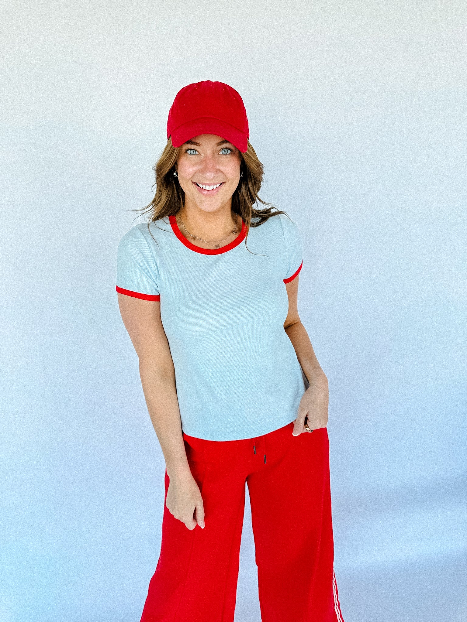 Elevate your casual wardrobe with our timeless classic. Made from a soft and stretchy rayon span rib fabric, this tight-fit tee features chic capped sleeves with bold contrast neck and sleeve binding, adding a touch of flair to your everyday look. The easy casual crewneck design makes it perfect for pairing with any of our denim bottoms, ensuring effortless style and comfort. Whether you're dressing up for a day out or keeping it low-key, this versatile baby tee is your go-to choice for a fashionable yet relaxed ensemble.