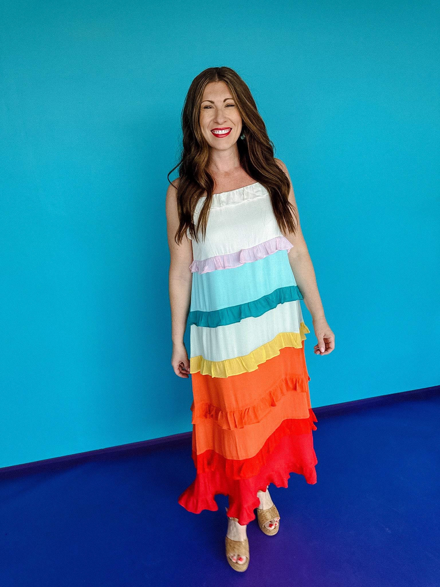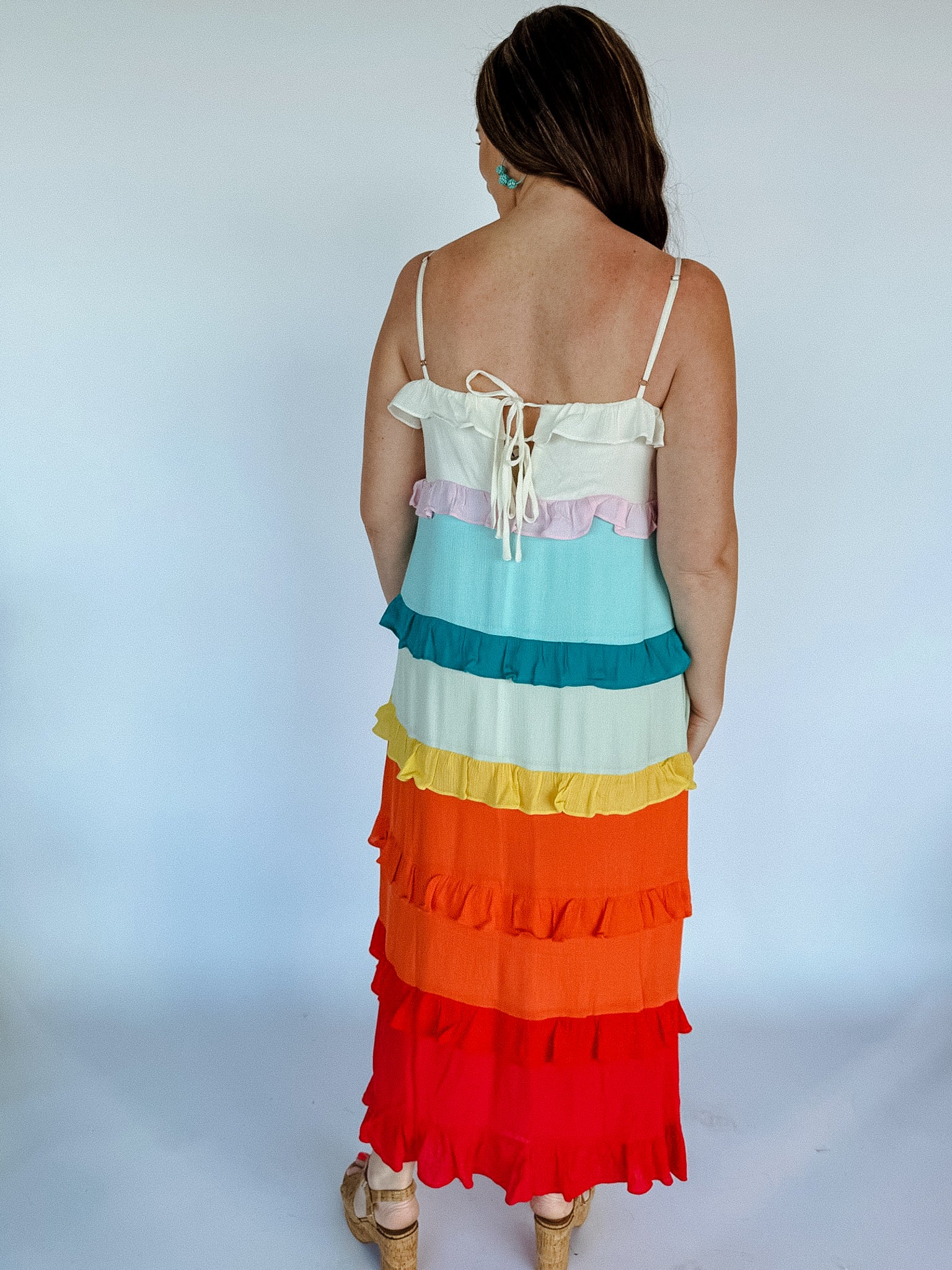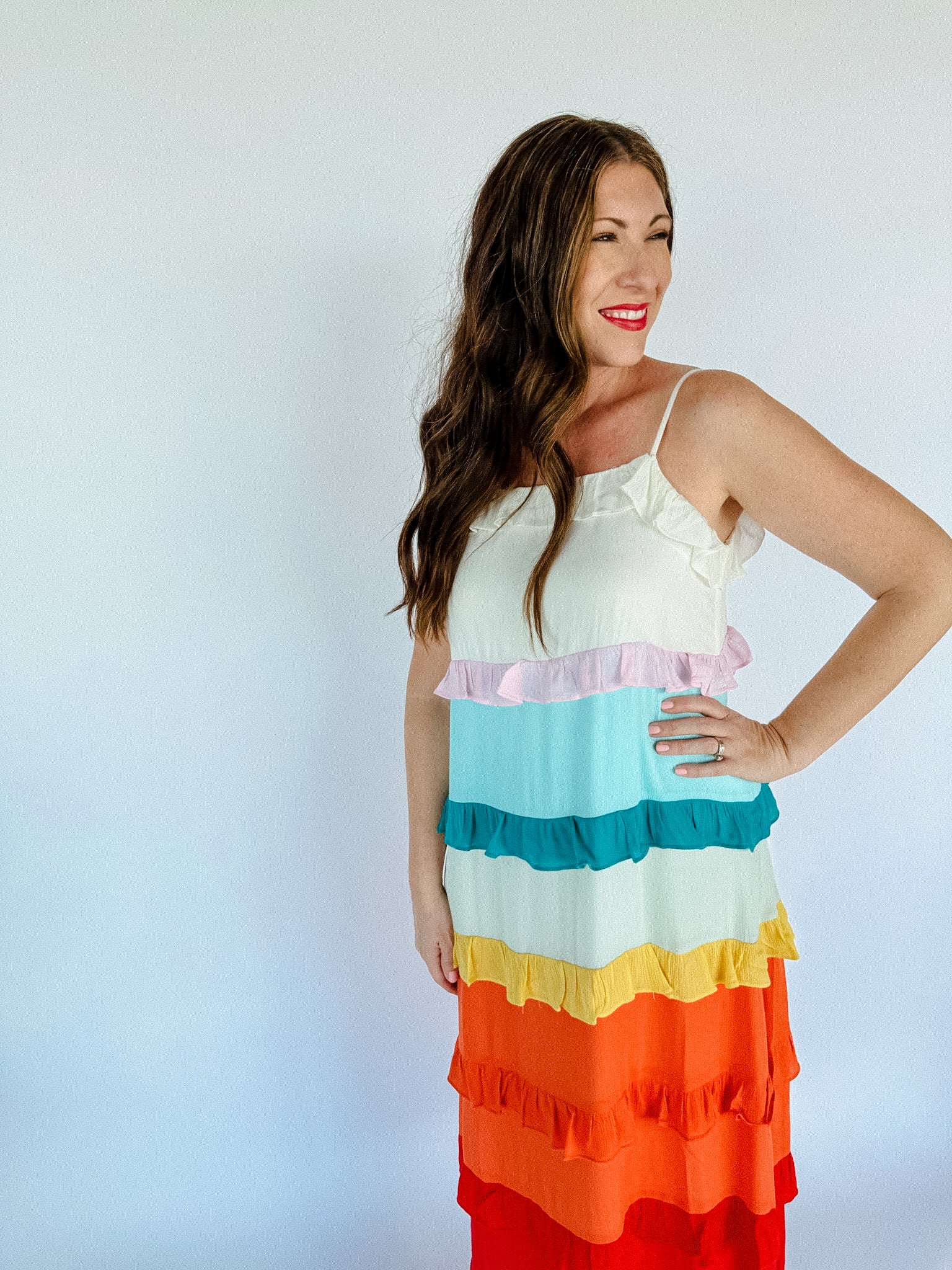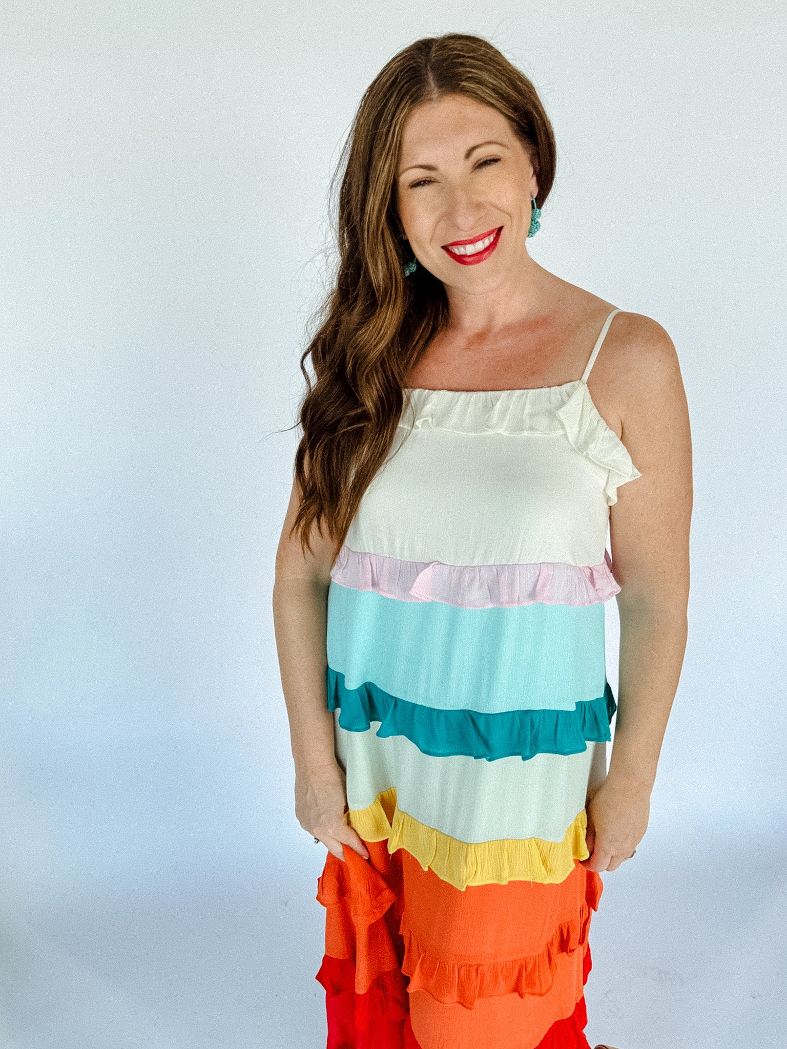 Taste the rainbow in this adorable maxi dress! This dress has a relaxed fit through out and has multi color ruffle details. Pair it with sandals or strappy heels to complete the look!