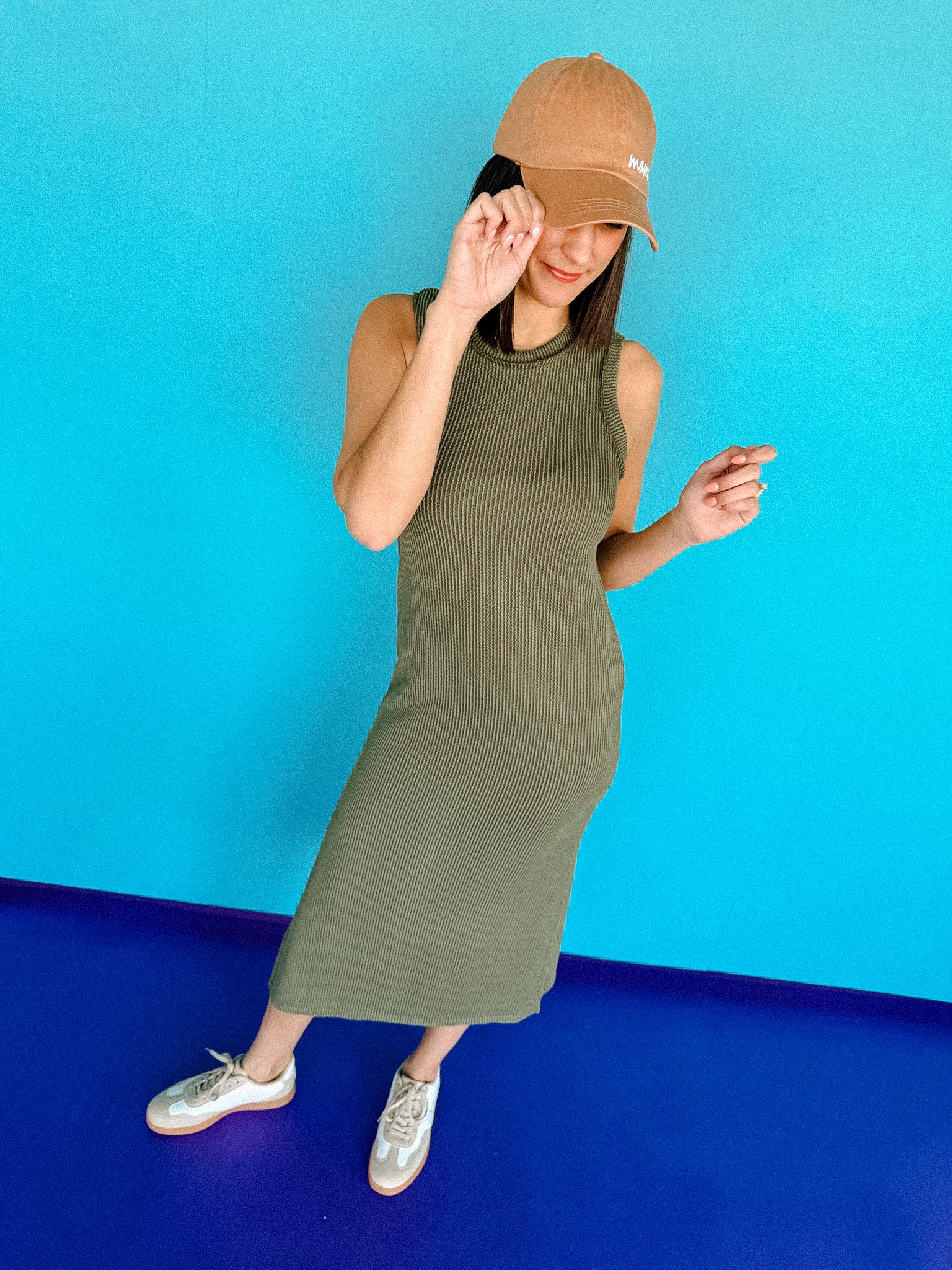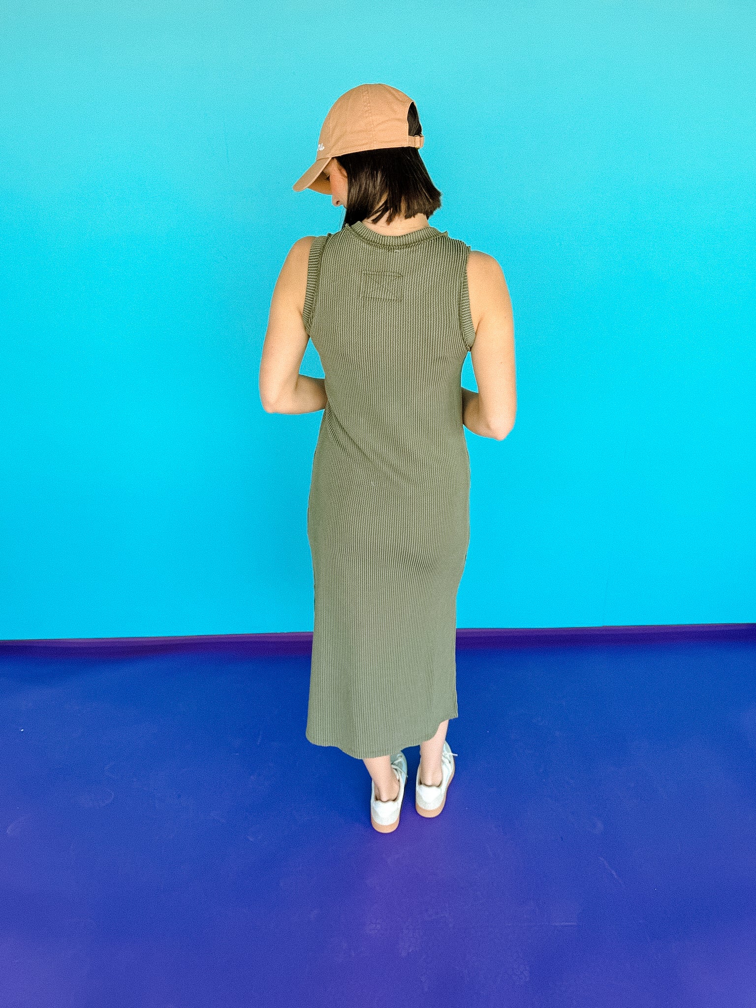 Strike the perfect balance of casual and elevated with the Paula Ribbed Midi Dress. Made of ribbed fabric and featuring a relaxed silhouette, this sleeveless maxi dress is perfect for versatile styling. With a rounded neckline and side slit detailing, it's both practical and stylish. Olive never looked so good!