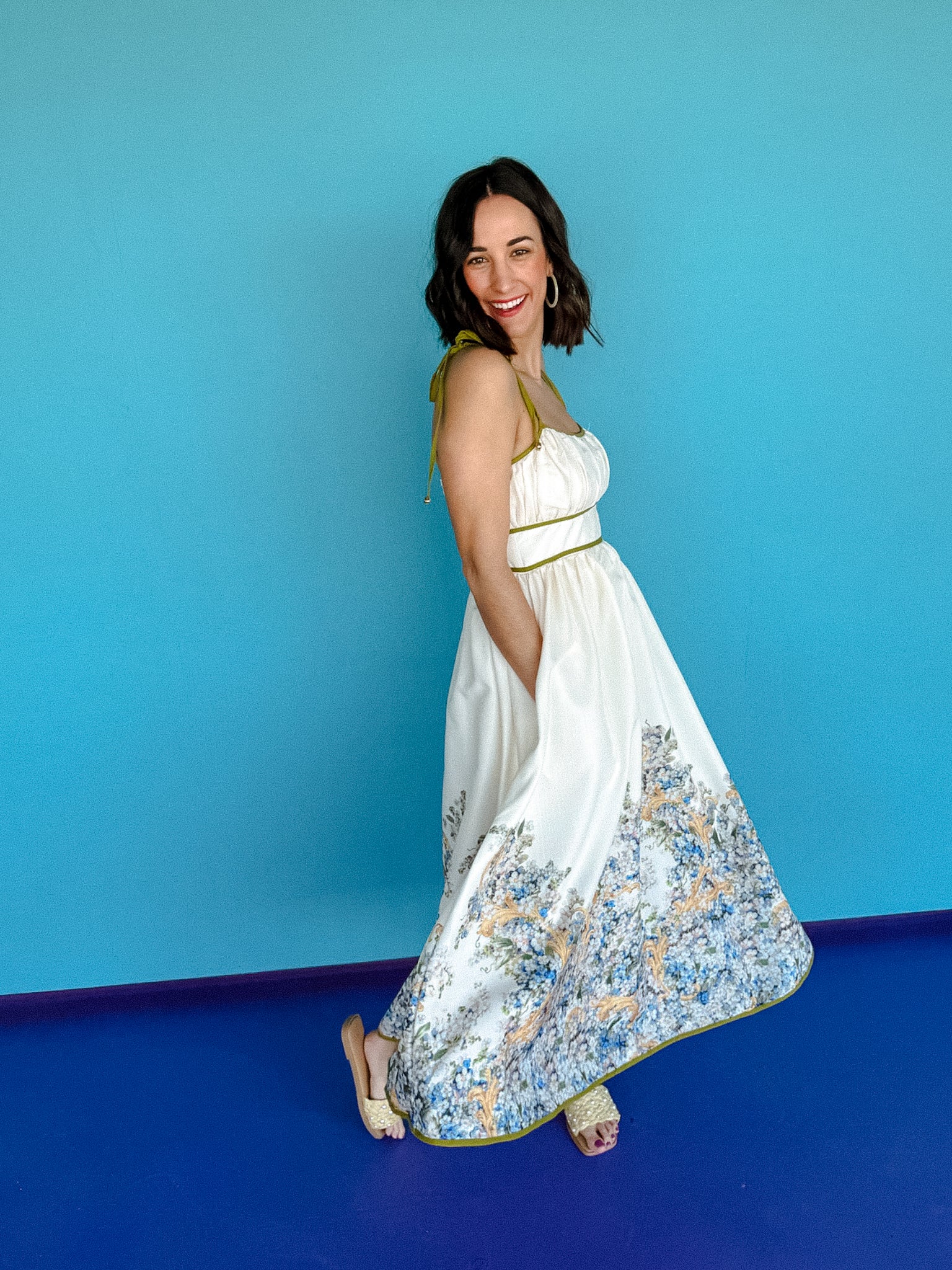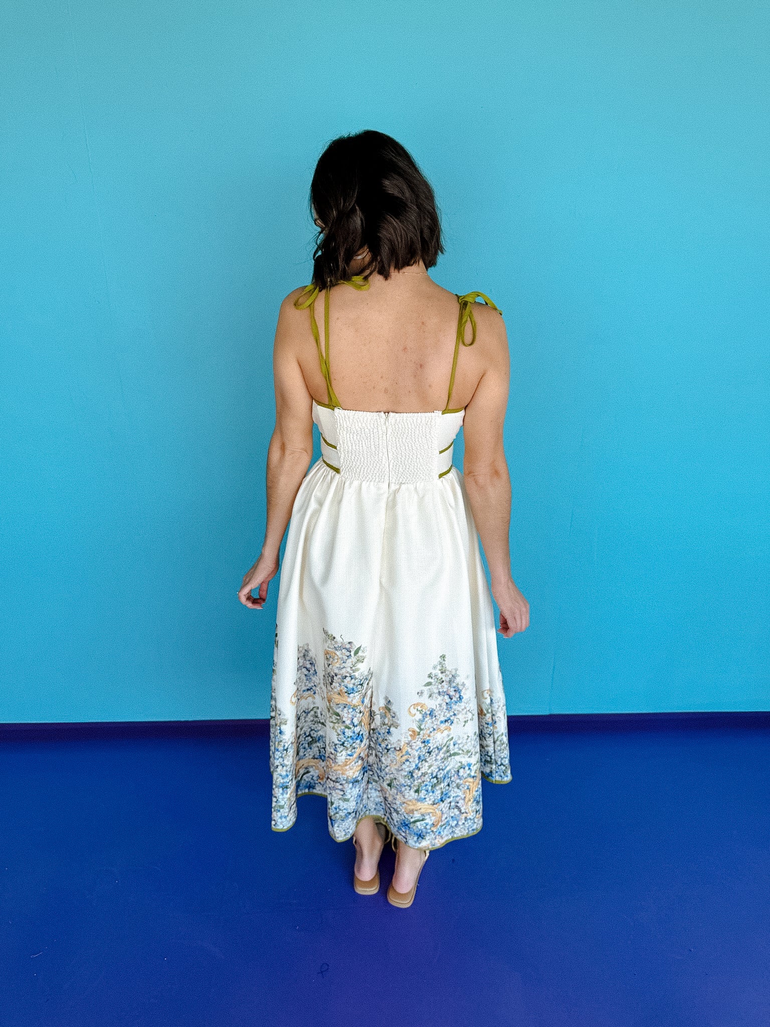 Get ready to blossom in the charming Willow Floral Midi Dress. Featuring a playful shoulder tie and accented border hem, this dress is perfect for any occasion. The smocked zipper closure and convenient pockets make it both stylish and practical. It's a must-have for your wardrobe.